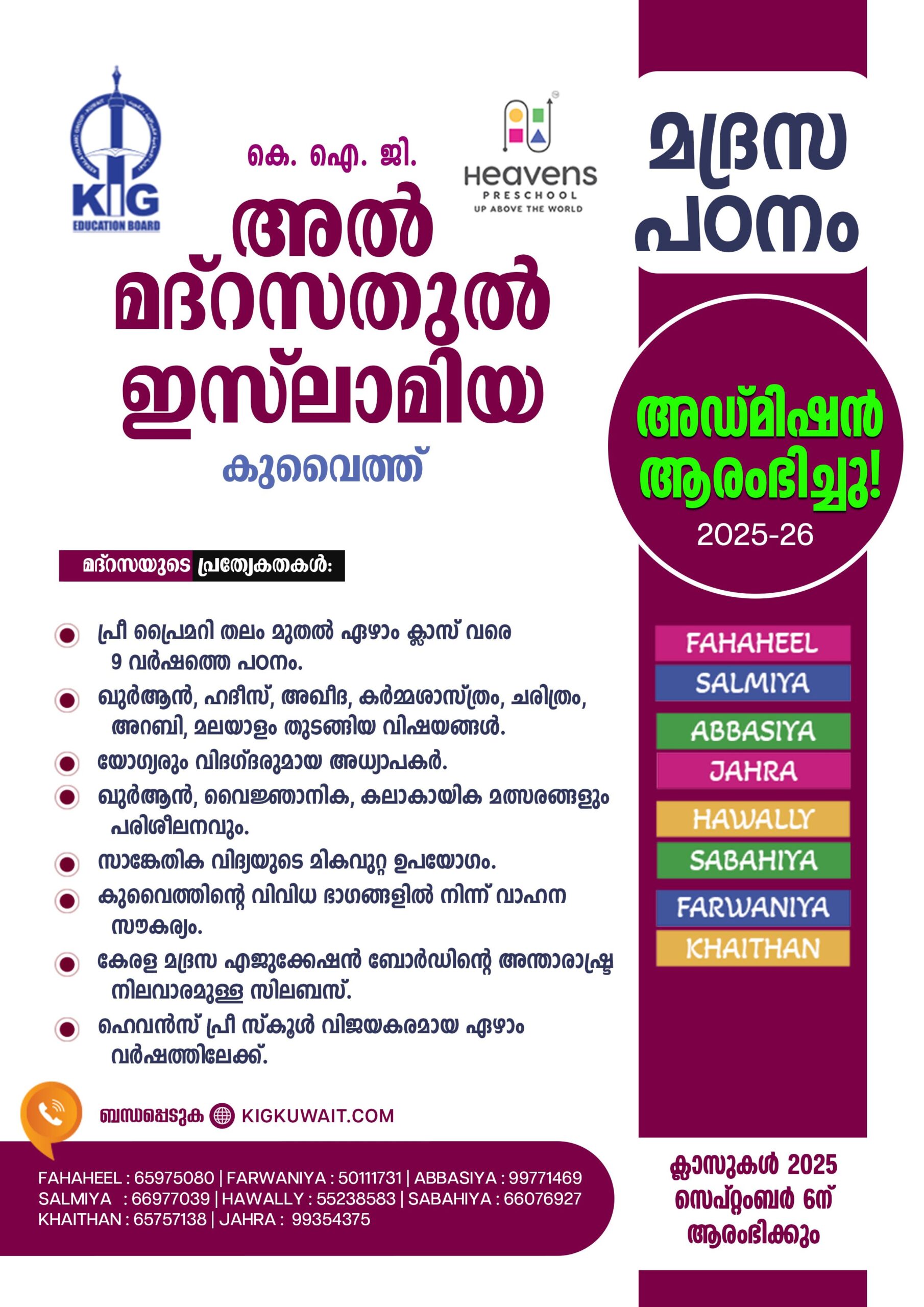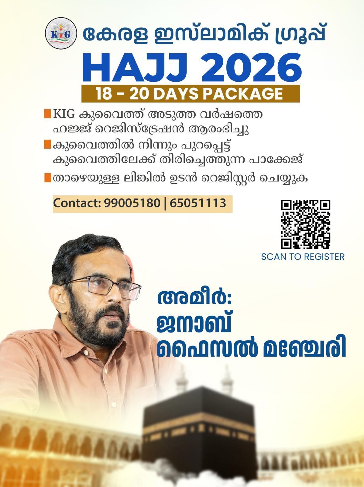 കഴിഞ്ഞ അഞ്ച് പതിറ്റാണ്ടായി കുവൈത്തിലെ മലയാളി പ്രവാസി സമൂഹത്തിന്നിടയില് കൃത്യവും വ്യക്തവുമായ വീക്ഷണം കൊണ്ടും കര്മത നൈരന്തര്യം കൊണ്ടും നിറസാന്നിധ്യമായ പ്രസ്ഥാനമാണ് കേരള ഇസ്ലാമിക് ഗ്രൂപ്പ് (കെ. ഐ. ജി). കെ. ഐ. ജി. വെറും ഒരു സംഘടനയല്ല. മറിച്ച്, നിരവധി വൈവിധ്യമാര്ന്നയ സാമൂഹ്യസേവന സംവിധാനങ്ങളുടെ തണല് വിരിക്കുന്ന, കുവൈത്തിലെ പ്രവാസി സമൂഹത്തിന്നിടയില് ആഴത്തില് വേരൂന്നിയ നിത്യഫലദായകമായ ഒരു വടവൃക്ഷമാണത്….Read More>>>